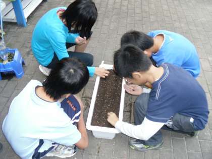 4人で1つのプランターを使って,土を入れるところから始めました。