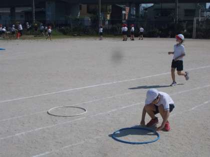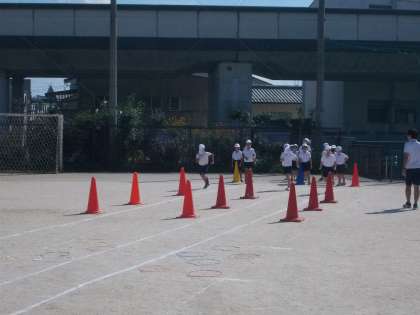 全校体育DAYのバラエティ走に向けて、競技の練習をしました。子どもたちは、先生が説明しながら見本をみせているときに、「えっ、楽しそう!」「簡単やん」「できるかな〜」と競技に対して前向きな言葉を言っていました。フラフープをくぐった後の決めポーズが、一人一人違った個性あふれるポーズで可愛かったです!