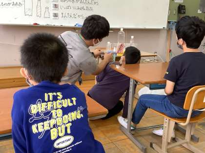 色のついた水が入った大きさの違うペットボトルの中身をくらべ、どれが一番多いのかを考えました。同じいれものにいれること、それを「くらべる博士」とともに並べて、くらべることでどれが一番多いのかが分かりました。