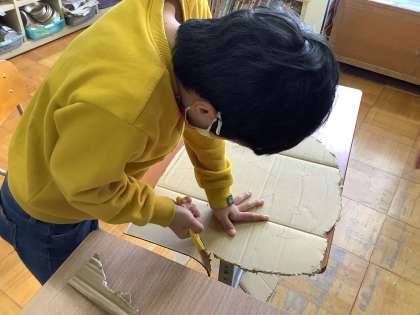 は組では、ハロウィンに向けて、ハロウィンのかざり作りを頑張っています!段ボールカッターを使って、大きなダンボールパンプキンを作ったり、黒色の画用紙を手で割いて丸めてハロウィンの木々を作ったりしています。子どもたちは、ハロウィンが好きということもありハロウィンのかざりづくりをとても楽しみにしています。
