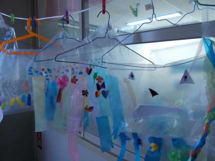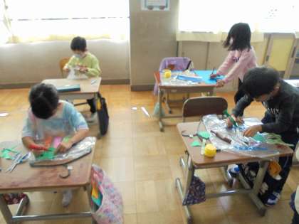 今日の図画工作では、「何色にしようかな。」「長くしてみようかな?」「ここにもつけてみよう。」と考えながら、風にゆれる飾りを作りました。ドレス、くらげ、イカ、おばけなどいろいろなものがひらひらゆれて、とても楽しそうです。