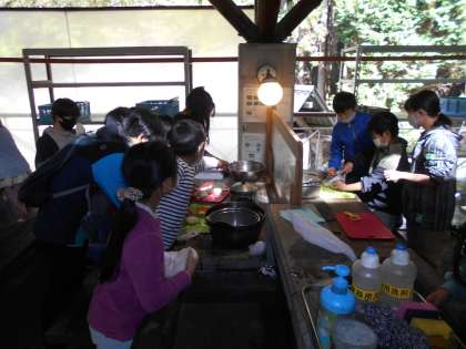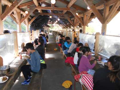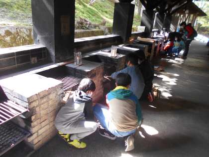 山の家での最後の活動は野外炊事です。かまど係と調理係に分かれてカレーライスを作りました。力を合わせておいしいカレーができました。とてもおいしかったのでたくさんおかわりをしていました。最後の後片付けでは、来た時よりも美しくを心がけて頑張りました。とてもきれいにしたので山の家の職員さんが驚かれ、ほめていただきました。