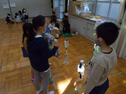 数カ月にわたり継続して取り組んできた「あそんでためしてくふうして」ですが、作成したおもちゃやゲームを1年生に遊んでもらい、終わりを迎えました。