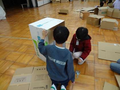 段ボールの中に入ったりかぶったりして、お風呂や小屋など、思いついたものを作ることができました。