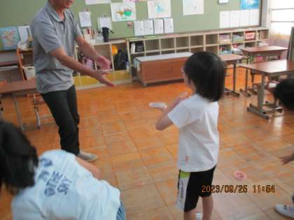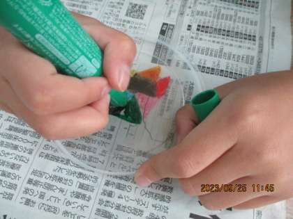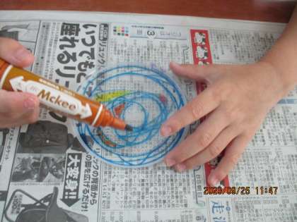自分の好きな模様の手裏剣づくりをしました。ペンで色をつけ、できあがった手裏剣を手に投げたり飛ばしたりして、楽しみました。