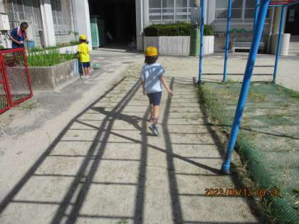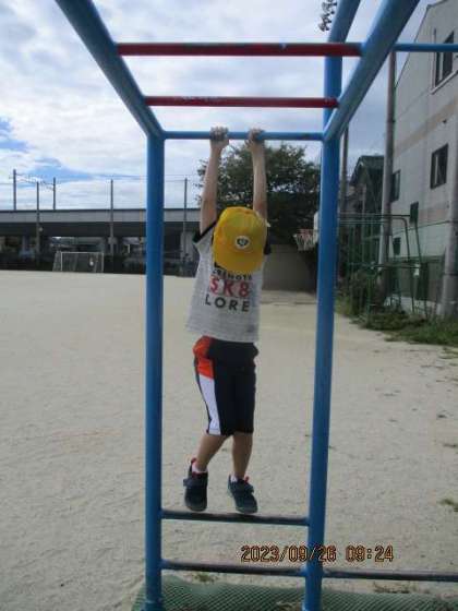 朝の水やりやウサギのえさやりの後に雲梯の影を使って、リズムに合わせて「ケン・ケン・パ」の練習をしたり、雲梯にぶら下がったりしています。