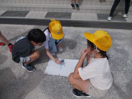 理科『地面の様子と太陽』で、影のでき方や日向と日陰の様子の違いについて学習しています。朝・昼・下校前の影を観察して、「影がめっちゃ動いている!」と驚いたり、遮光版の使い方を学習した後に「すごい!太陽ってこんな風になっているんや。」とつぶやいたりしていました。