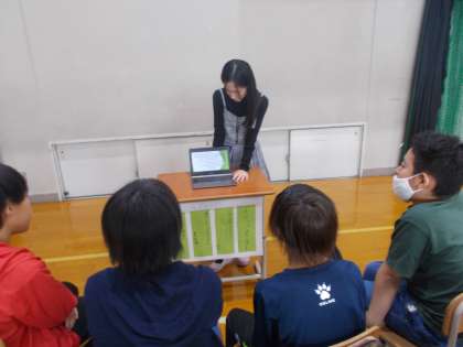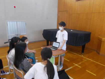 6年生の総合の学習「朱二っ子プロジェクト」の学びの集大成として、5年生にこれまで万仇ことをパワーポイントを使って発表しました。よりよい発表の工夫として、問いを投げかけたり、質問をしたりなど聞き手を引き付けることを意識できました。朱二のリーダーである6年生としてよいお手本の姿を示すことができましたね。