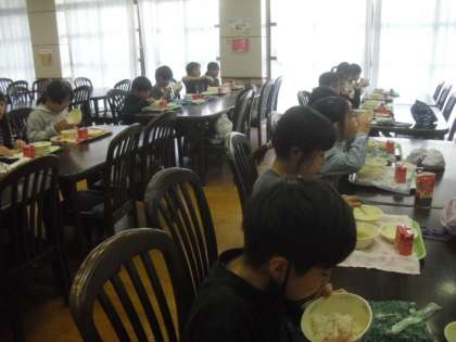 食の学習の後のランチルーム給食では、初めてのランチルームでの食事に戸惑いながらも楽しんで食事する姿が見られました。