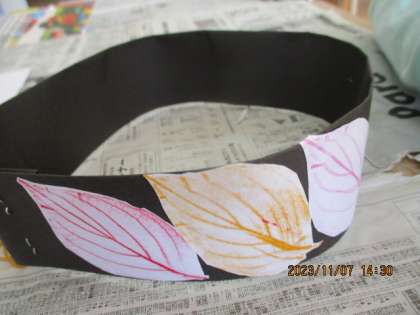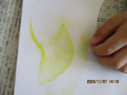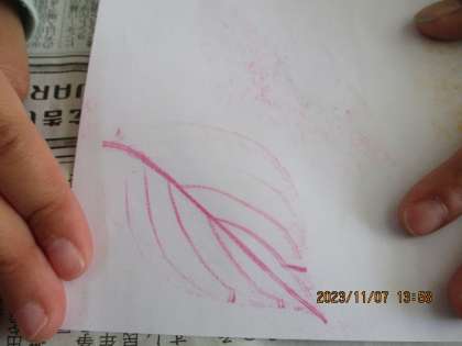 けやき広場のサクラやイチョウ、アメリカハナミズキの葉っぱの「こすり出し」をしました。紅葉している黄色やオレンジ、赤だけでなく、自分の好きな色でも試していました。葉っぱの模様が浮きあがってきたときが楽しかったようです。
