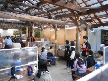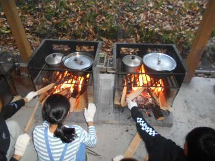 今日の夕食は、野外炊事のカレーです。山の家の職員さんに教えていただいてから、調理担当とかまど担当に分かれて作りました。慣れない手つきで野菜を切ったり、うまく火がつかずに苦労したりしながらも協力して作りました。