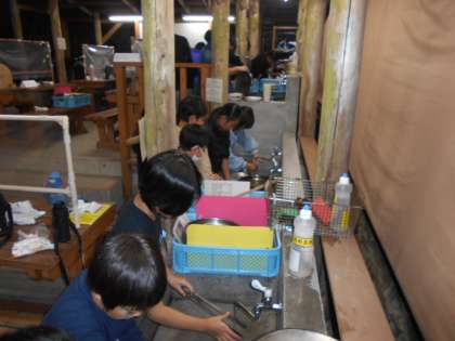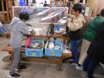 おいしく食べた後は、片付けです。鍋や皿ををきれいに洗ったり、ふきんで水気をふいたりしました。ピカピカになるように最後までがんばりました。