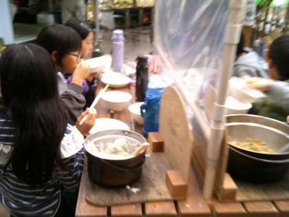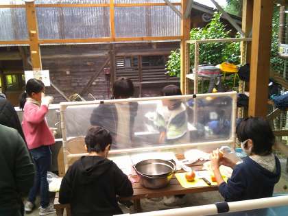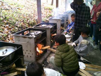 花背山の家最後の活動は野外炊事で「すき焼き風煮」を作りました。1日目に、カレーを作っているので、それぞれの担当に分かれ手際よく活動を進めていました。雨が降っていたため薪に火がつくまでに時間がかかりましたが「火をつけるって、大変だな。昔の人は毎日このようにしていたなんて驚いた。」「料理をすることも大変だし、おうちの人が毎日作ってくれていることが嬉しい。」など昔の生活の大変さや現在の生活の便利さ、おうちの方への感謝の気持ちなど様々な気づきの声が聞かれました。