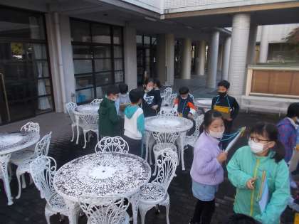 「プールが2階にあるのって、珍しいんじゃないかな。」「運動場の周りに花畑があると心が癒される。」「外でテーブルに座れるのっていいよな。」など、校内を探検しながら、自分たちの学校の良さを再確認していました。