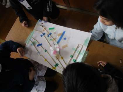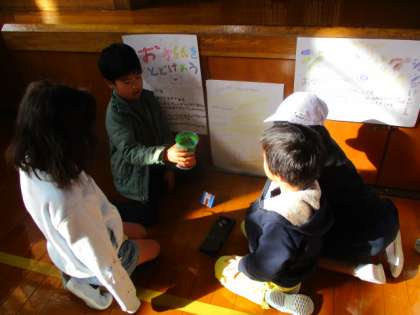 2年生に招待してもらい、「おもちゃランド」を楽しみました。ペアのお兄さん、お姉さんと一緒にそれぞれのコーナーを回りました。磁石で動かす迷路やゴムを使って跳ばすゲーム、タワーのように積み上げるコーナーなど身の回りにあるものを使い、ルールにも工夫があって、どのコーナーも楽しかったようです。教室に戻ってから、楽しかったコーナーを交流して、お礼の手紙をかきました。