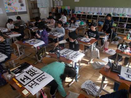 書写の時間に習字をしました。準備や片づけが素早くなり、筆の動きや文字の太さに気を付けながら書けるようになってきました。