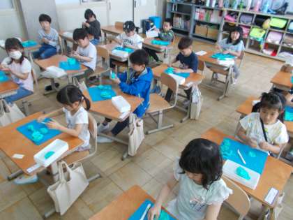 今週の図画工作科の学習で粘土を使いました。まずは、新しい粘土を丸めたり、伸ばしたり、細くしたりして色んな形ができるのを確かめました。そのあと、その形を組み合わせて自分の好きなごちそうを作りました。「好きな食べ物を集めて、お子様ランチを作ったよ。」と嬉しそうに自分の作ったものを紹介したり、「うわぁ、おいしそう。お腹すいてきた。」と言ったりする姿が見られました。