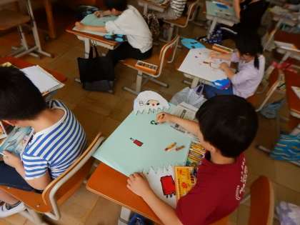 図画工作科の学習では、「ふしぎなたまご」の学習を進めています。ふしぎなたまごから生まれる世界を描いていきます。「どんなふしぎなたまごを描こうかな。」「割れたたまごをどのようにおこうかな。」「海の世界にしたいから、魚などの生き物をたくさん描こう。」など自分の表したい世界を考えながら描いていました