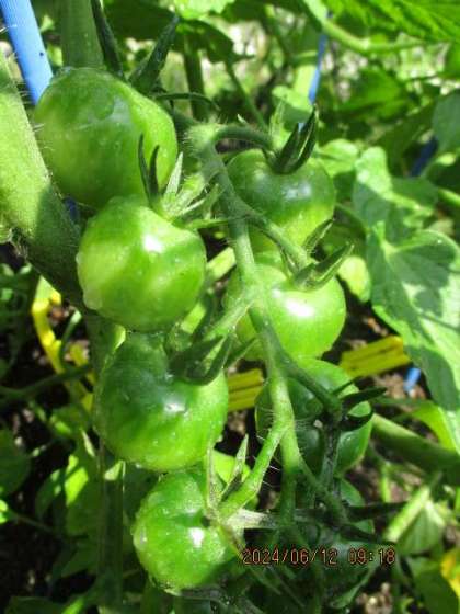 自分の植木鉢や畑で育てている夏野菜がぐんぐん育っています。キュウリは、花が咲いた後に小さな赤ちゃんキュウリが見られ、触るとチクチクしていました。また、ピーマンは実が日に日に大きくなっています。ミニトマトは、ビー玉くらいの大きさの実がいくつも見られ、茎や葉もトマトのにおいがしています。
