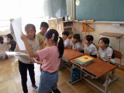 今週のぐんぐんタイムに、3年生が本紹介をしに教室に来てくれました。おススメの場面の読み聞かせやお話に関するクイズなどもあり、3年生の発表を熱心に楽しそうに聞いていました。「○○の本の続きを読みたくなりました。」「クイズが楽しかったです。」「タブレットを使っててすごいと思いました。」など3年生のお兄さんお姉さんたちをキラキラとした目で見つめながら感想を伝えていました。読書の秋、多くの本を読む機会となればと思います。