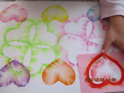 図画工作科の学習で、自分の好きな型紙をつくり、パスで色を擦り出しました。色を変えたり、並べたり、重ねたりして楽しい作品に仕上げました。