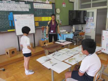 今日は,今年度一回目のALTの英語の授業でした。始めは,昨年度学習していた動物の名前を使ったビンゴゲームをしました。自分の好きな動物カードを9枚選び,順番にサイコロをふって,出た目によって動物を選んでいきました。最後は,二人とも,全部ビンゴになって大喜び。大きな声で動物の名前を言いながら,楽しく学習しました。