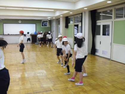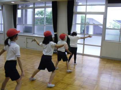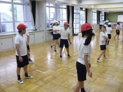 体育の学習で「リズムダンス」に取り組んでいます。グループで曲を選び,曲のリズムに乗ってダンスを作っています。休み時間や放課後にも練習を重ね,かなり形になってきました。
