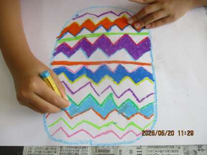 「ふしぎなたまご」では、まず、どんな形や色、模様のたまごかを想像して描きました。次は、そのたまごからどんな世界が生まれてくるのかどんなお話が生まれてくるのか想像したことを描きたしていきます。