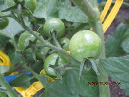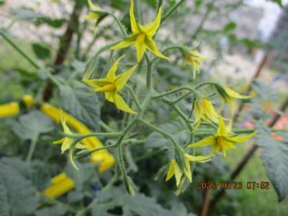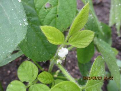 畑で育てているエダマメに白い小さな花が咲きました。ミニトマトは、黄色い星みたいな形の花を咲かせています。また、花の後にはビー玉ぐらいの大きさの緑色の実ができています。