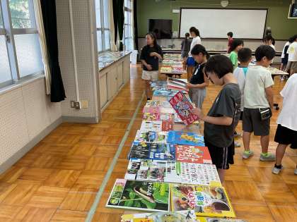 自分が学校図書館においてほしい本を1 冊選んで投票する選書会を行いました。表紙や題名からどんな内容の本なのか、わくわくしながら読み、1冊を選んでいる様子が見られました。