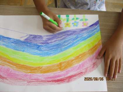 未来のまちについて考え、それぞれの思いを絵で表現しました。「強い恐竜たちのいる世界がいいなぁ。」「大きな虹がかかり、たくさんのお花が咲いている素敵な場所がいいなぁ。」「自然がいっぱいで、動物がたくさん住んでいる森がいいなぁ。」ていねいに最後まで仕上げました。