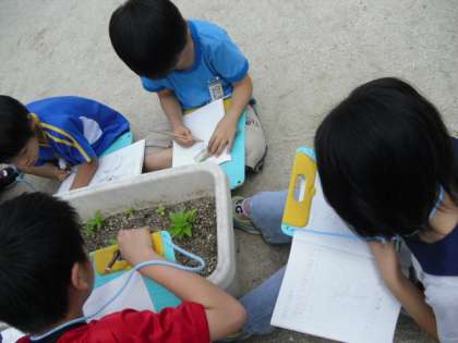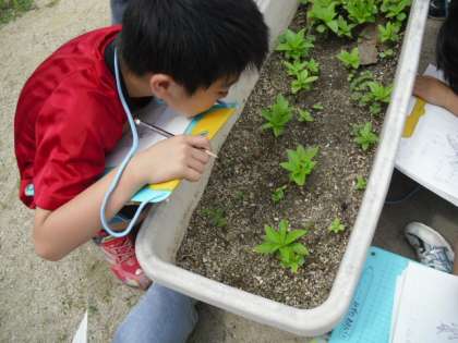 丸い形の子葉と、形の違う本葉の違いを比べたり、草丈をはかったりと、意欲的に観察しました。