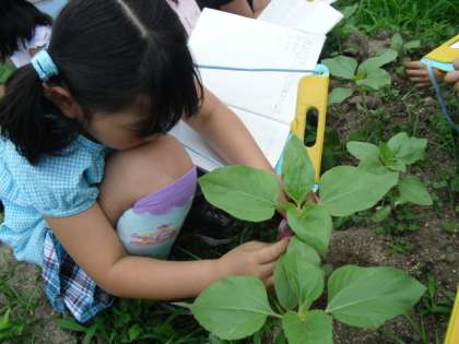 同じ日に植えたのに、ホウセンカよりも草丈が倍以上あるヒマワリの成長に驚いた様子でした。