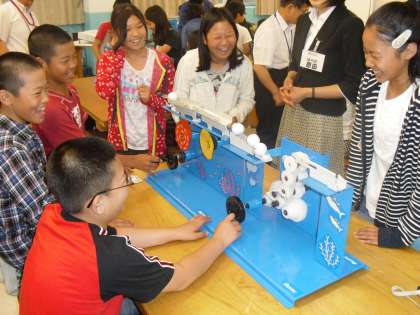 つまみを回転させることで,ゴルフボールを順に送っていく機械があります。しかし,わざとカムやクランクのネジがゆるめてあり,上手くボールが送れません。子どもたちは,相談したり,試行錯誤したりしました。すばらくすると,全てのグループがなんとか動かせるようになり,後は,笑顔,笑顔でした。
