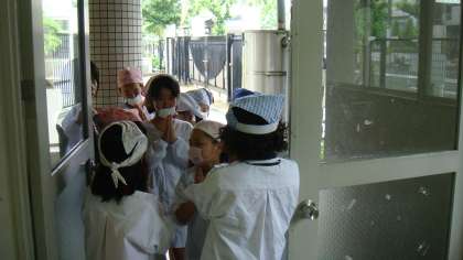 今日の献立は,「麦ごはん・牛乳・鶏肉と里いものあまから煮・小松菜のごまいため・みそ汁」でした。