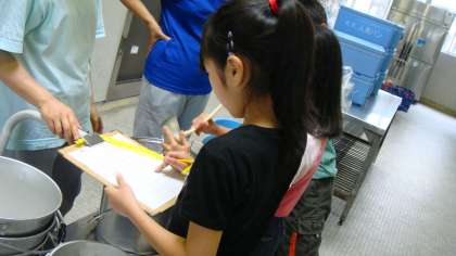 食育の日の取組として給食委員会の児童が喫食状況を調べています。