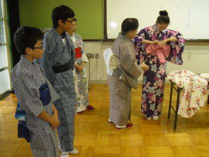 説明を受けている間,子どもたちは少し緊張気味でしたが,いざみんなで浴衣を着てみる段階になると,いちどに緊張が解けました。着方を教え合い,家から持ってきた浴衣を着る子,貸していただいたものを着た子,それぞれが満足の笑顔でいっぱいでした。