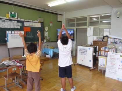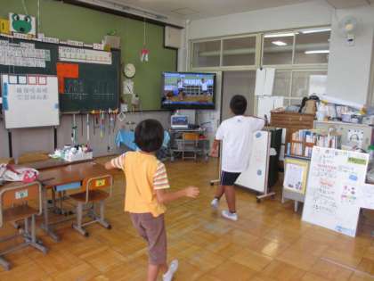 運動会の開会式で,準備体操の全校ダンスをします。各教室からビデオを見られるようになっているので,は組の二人も,毎日のように練習しています。全校練習の時には,だいたい覚えて動けるようになっていました。