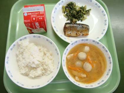今日の献立は,「麦ごはん・牛乳・さんまのかわり煮・だいこん葉のごまいため・いものこ汁」でした。