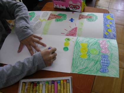 冷蔵庫の扉をあけるとき「今日のケーキは何かな?」「美味しいも食べ物が入っているかな?」とドキドキ・ウキウキします。そんな思いを画面に表しました。3つの扉から,楽しことや,ウキウキすることが飛び出してきます。1番ウキウキしているのは,作っている子どもたちでした。