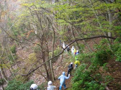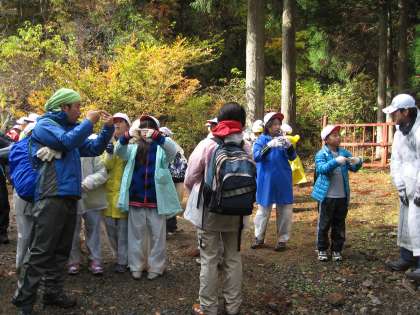 小雨をしのぎ,杉木立の中で立ったままみんなで