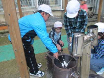野外炊事のお楽しみで,焼きマシュマロを作りました。長い竹串にマシュマロを差して,ハヤシライスを作った残りの火で少し焼き色がつく程度に焼きます。それを,ビスケットに挟んで食べると,マシュマロの食感が変わり甘さが引き立ち,とても美味しいおやつになりました。