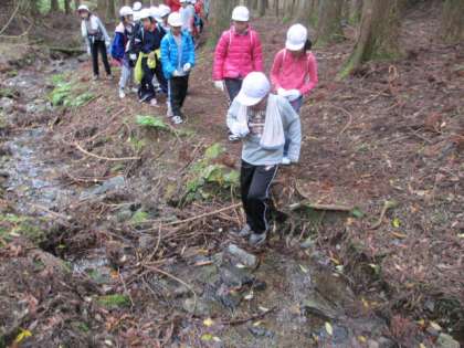 4日目は,いよいよ雲取山登山です。この日のために毎朝走って体力作りをしてきました。登り始めて1時間くらい,きつい坂道が続きます。だんだん暑くなり上着を脱いで,頑張って黙々と登りました。頂上に着く頃には,小雨が降り始めるあいにくの天気でしたが,みんな元気!一緒に来てくださった花背山の家の職員の方が,ビックリするほどのハイペースで登りました。最後まで本当によく頑張りました。