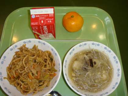 今日の献立は,「ソース焼きそば・牛乳・スープ・みかん」でした。