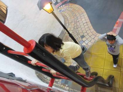 キッズプラザに着くと,始めは4〜5階が吹き抜けになっている「こどもの街」で,ハシゴを登ったり,滑り台をしたり,吊り橋を渡ったりしていっぱい体を動かしました。今日は寒い日でしたが,館内は動き回ると暑いくらいでした。