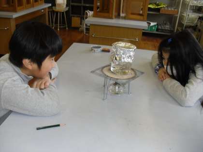 理科室での実験をとっても楽しみにしている4年生です。今回の実験は,「水を沸騰させて出てくるあわの正体は何?」です。子どもたちは,水が沸騰していく様子を興味深く観察しています。また,いつも見ている湯気ですが,出てくる湯気の様子をじっと観察してたくさんの気付きをしていました。