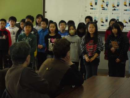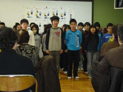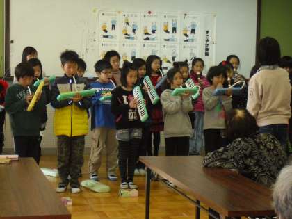 3回目の交流会になります。前回は,「優しい朱二のまち」について,地域の方が願っておられることをお聞きしました。今回は,そのお話を聞いて「優しい朱二のまち」にしていくために,自分たちができることは何なのかと考えたことを発表しました。「ぼくは明るい声であいさつをして元気になってもらいます。」「わたしは自転車の乗り方に気をつけたいです。」など「優しい朱二の町」にしていくために実践していきたい気持ちを伝えました。その後,ゲームをしたり合奏を聴いてもらったりして,楽しいひと時を過ごしました。
