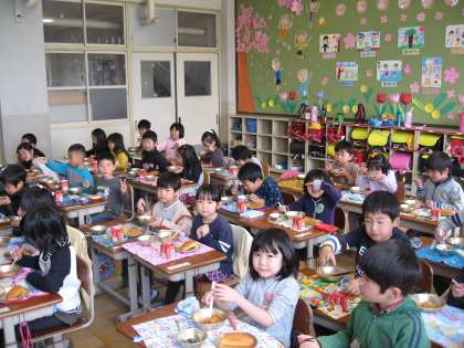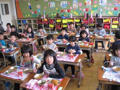 写真:1年生の給食の様子です。「おいしい」,「美味しい」と言ってしっかり食べていました。