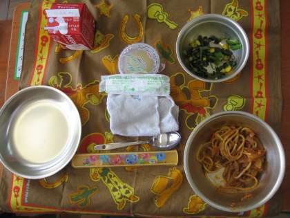 今日から給食開始です。平成25年度のスタート献立はスパゲティのミートソース煮とほうれん草のソティです。