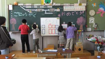 先生が問題を出すと、元気よく返事をして黒板へ向かい、